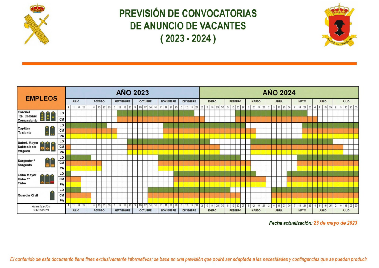 La Dirección General de la Guardia Civil ha anunciado un incremento de plantillas para el año próximo que el millar de guardias civiles además de publicarse el calendario con la previsión inicial de próximos anuncios de vacantes, una información de interés para muchos compañeros que desean solicitar algún cambio de destino.