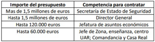 Entre los datos facilitados en la introducción se encuentra la intención de elevar el techo de gasto de cada unidad, siendo actualmente competente para contratar un presupuesto en la Guardia Civil según el importe de este el siguiente personal: