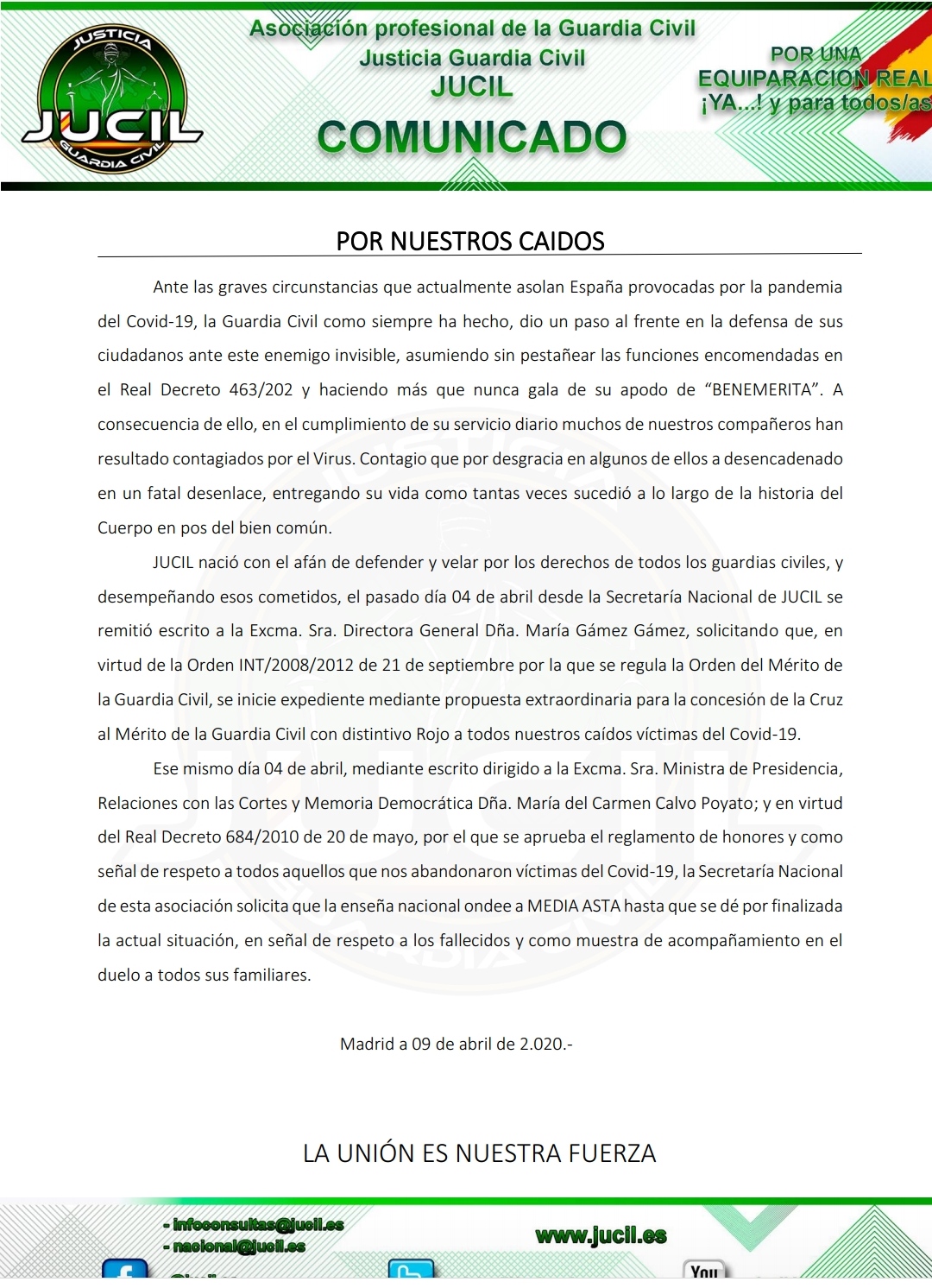 Comunicados JUCIL PIDE TEST PCR PARA EL CORONAVIRUS PARA TODOS LOS GUARDIAS CIVILES by Secretario Nacional Afiliaciones y Nuevas Tecnologías 18 abril, 2020 Publicado por Secretario Nacional Afiliaciones y Nuevas Tecnologías 18 abril, 2020 0 comentario 0 FacebookTwitterWhatsappTelegramCopy LinkEmail