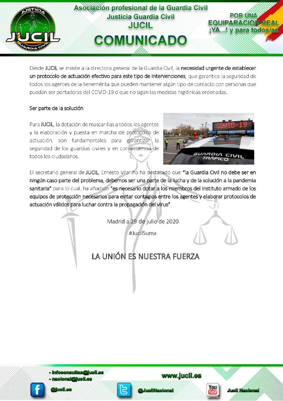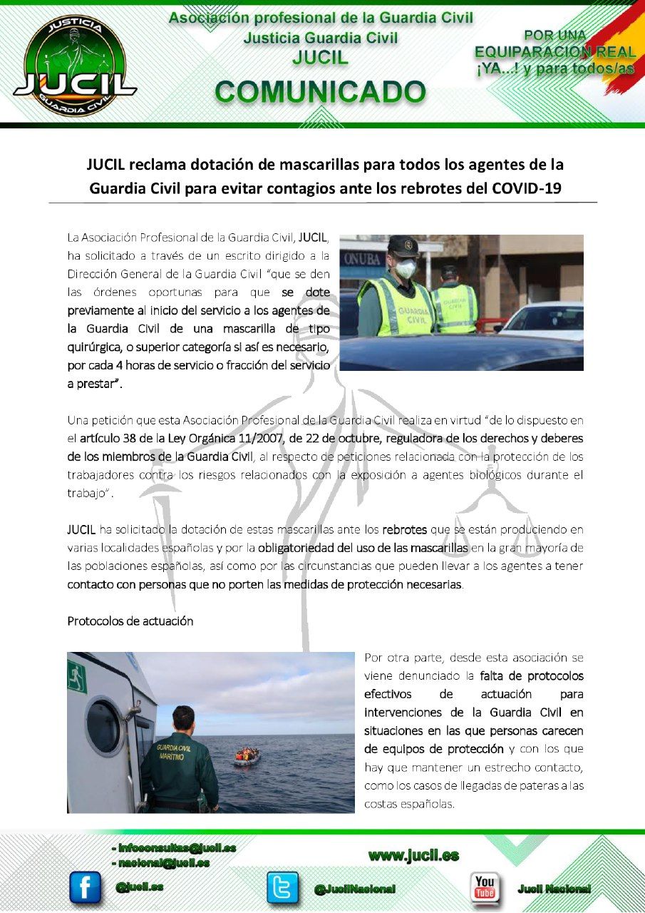 ComunicadosGCJucil Jucil reclama dotación de mascarillas para todos los agentes de la Guardia Civil para evitar contagios ante los rebrotes del Covid-19 by Secretario Nacional Afiliaciones y Nuevas Tecnologías 29 julio, 2020 Publicado por Secretario Nacional Afiliaciones y Nuevas Tecnologías 29 julio, 2020 0 comentario 0 FacebookTwitterWhatsappTelegramCopy LinkEmail
