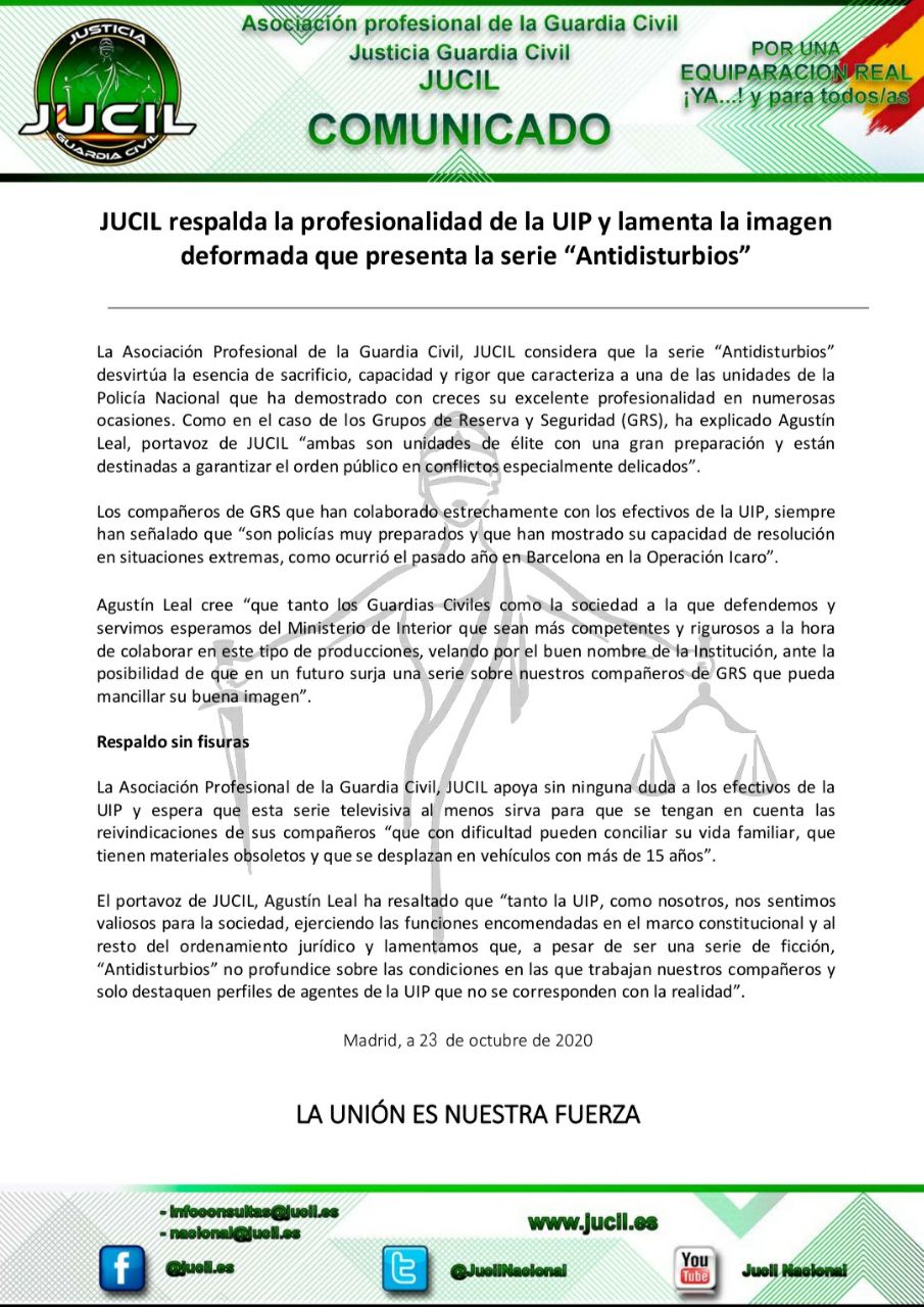 ComunicadosExternasJucil Jucil respalda la profesionalidad de la UIP y lamenta la imagen deformada que presenta la serie “Antidisturbios” by Secretario Nacional Afiliaciones y Nuevas Tecnologías 26 octubre, 2020 Publicado por Secretario Nacional Afiliaciones y Nuevas Tecnologías 26 octubre, 2020 0 comentario 1 FacebookTwitterWhatsappTelegramCopy LinkEmail