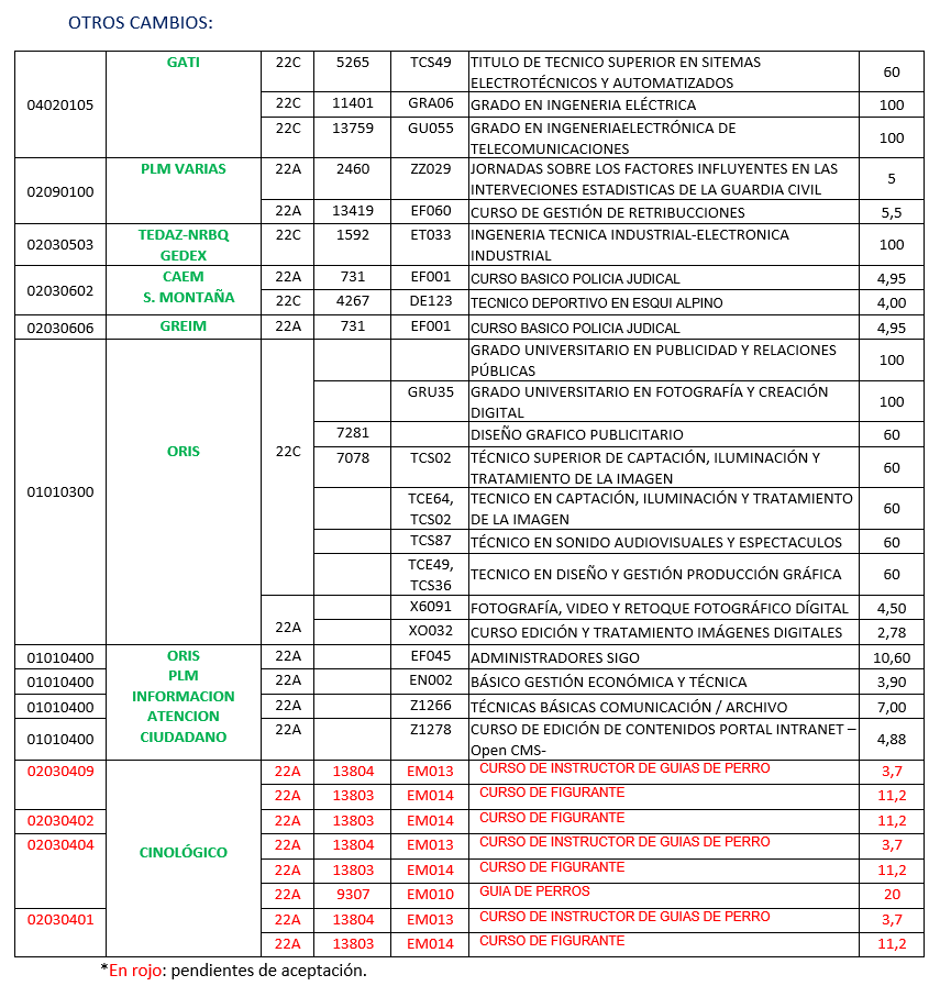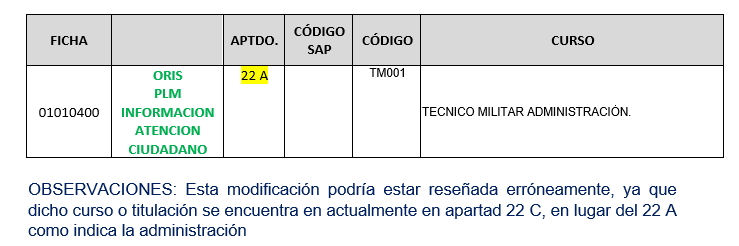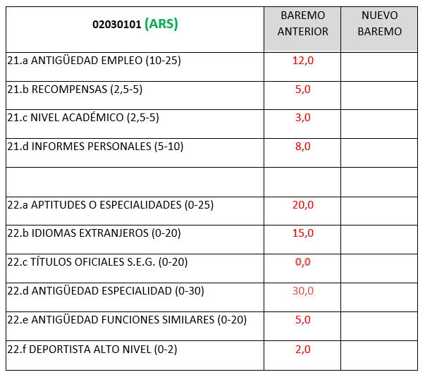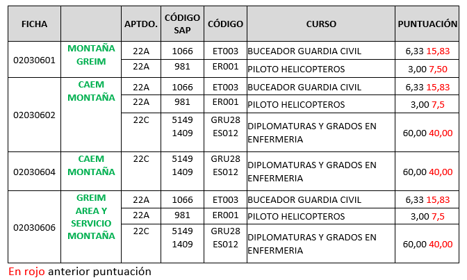 - Se cambia del apartado 22 c) Títulos oficiales del sistema educativo general fichas FISCAL Y FRONTERAS, (02060403, 02060405, 02060406, 02060408, 02060409 y 02060410) la titulación SEMINARIO FORMACION DE EVALUADORES SCHENGEN (CURSO BASICO) baremada con 50 puntos pasando al apartado Art. 22 a) APTITUDES Y ESPECIALIDADES (ENSEÑANZA DE PERFECCIONAMIENTO GC con una puntuación de 5 puntos