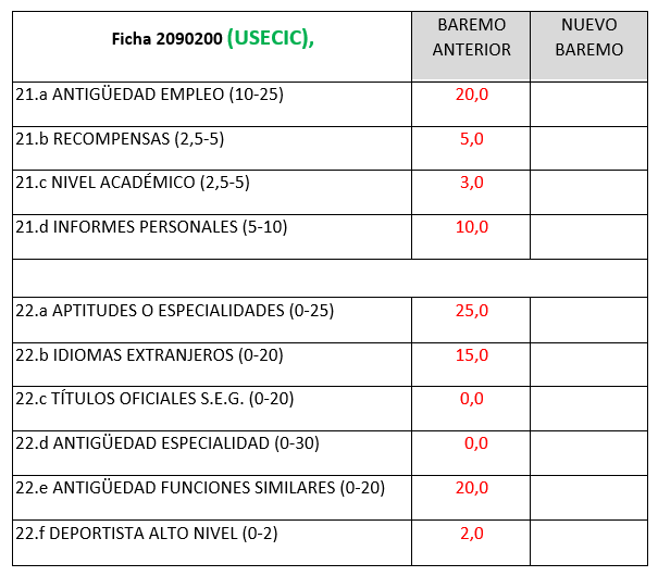 14.- En las fichas de méritos 02090200 y 02090201 (USECIC), así como en las fichas 02030101 (ARS) y 02030201 (GAR) se modifican los baremos de la siguiente forma: