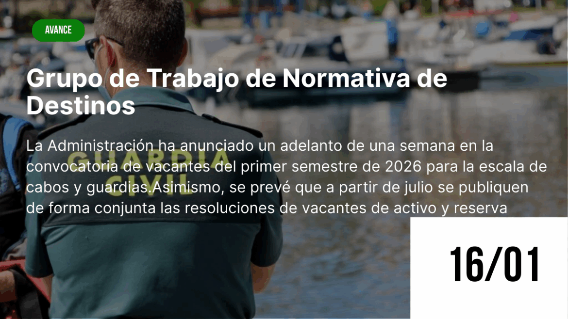 - CALENDARIO TENTATIVO CONVOCATORIA VACANTES PRIMER SEMESTRE DE 2026, se adelanta una semana la convocatoria de Guardias civiles, con el objeto de disponer más plazo de tiempo para resolución de las mismas, no afectado este adelanto a la posibilidad de petición de estas vacantes para los GC de nuevo acceso. Por otro lado, a partir de julio se tiene intención de publicar conjuntamente Resoluciones de anuncio vacantes ACTIVO Y RESERVA.