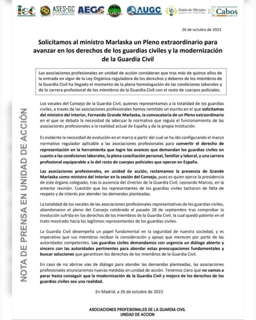 JUCIL lleva al Gobierno de España ante el Consejo de Europa por violar el derecho de sindicación de los guardias civiles