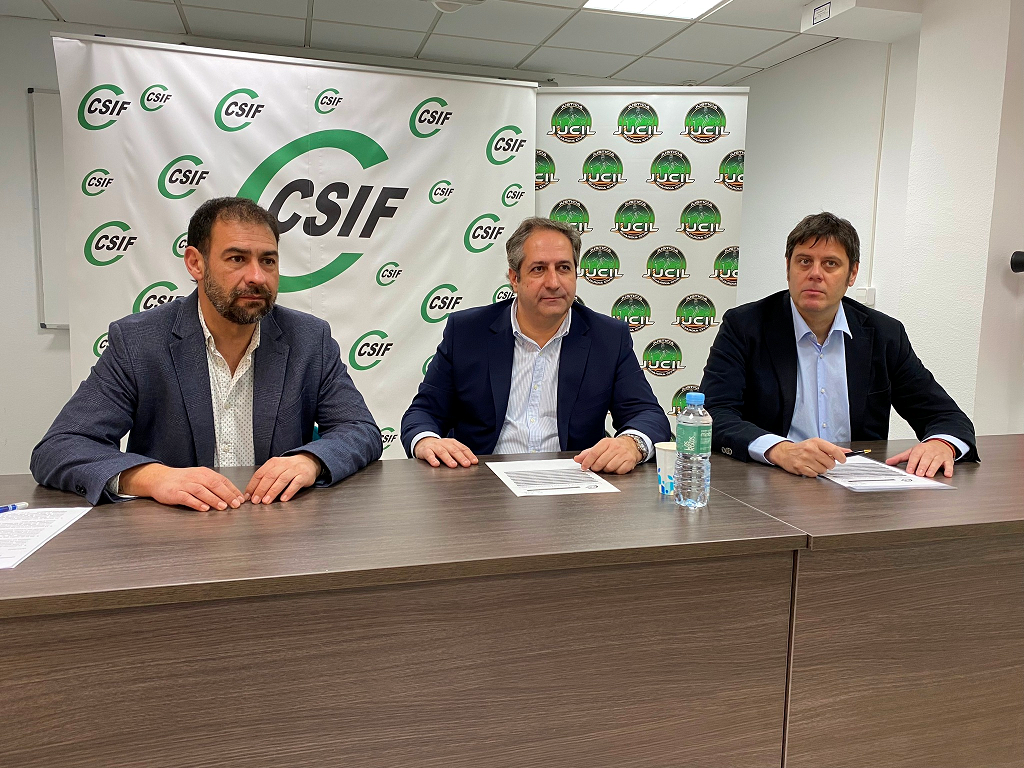 Ernesto Vilariño, secretario General de Jucil y Alberto Arranz, responsable del Servicio Jurídico de Jucil, junto al representante de CSIF y Secretario de Organización José Barranco, hoy en rueda de prensa. Acto en el que se han tratado las diferentes problemáticas de la Guardia Civil en la región de Murcia.