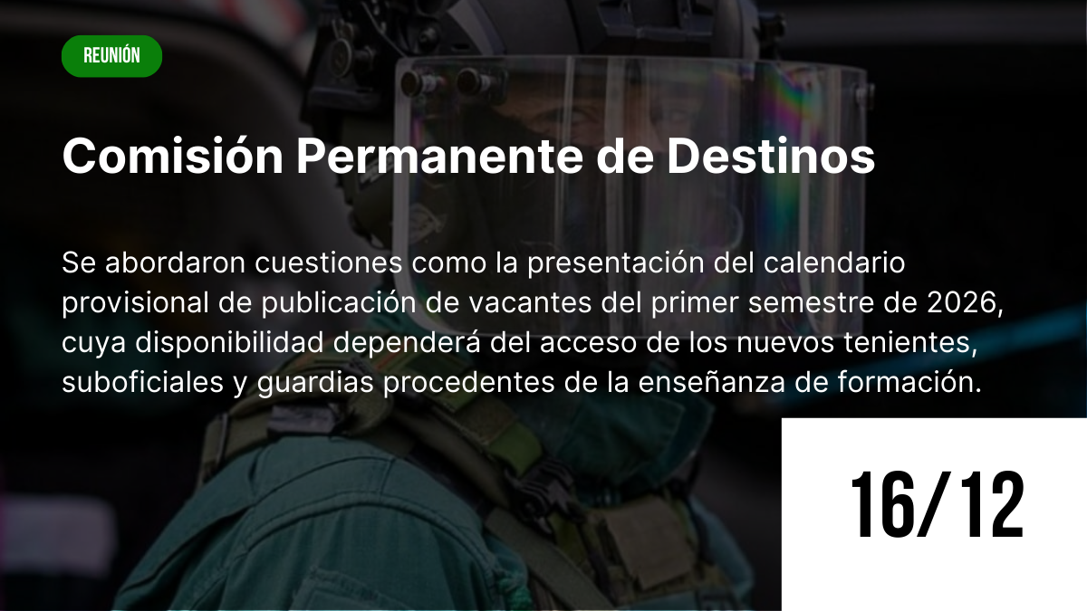 Durante la mañana del día 16 de diciembre de 2025, asistimos al Grupo de Trabajo “Comisión Permanente de Destinos”, celebrada en la Dirección General de la Guardia Civil, en representación de la Asociación JUSTICIA GUARDIA CIVIL (JUCIL), donde;