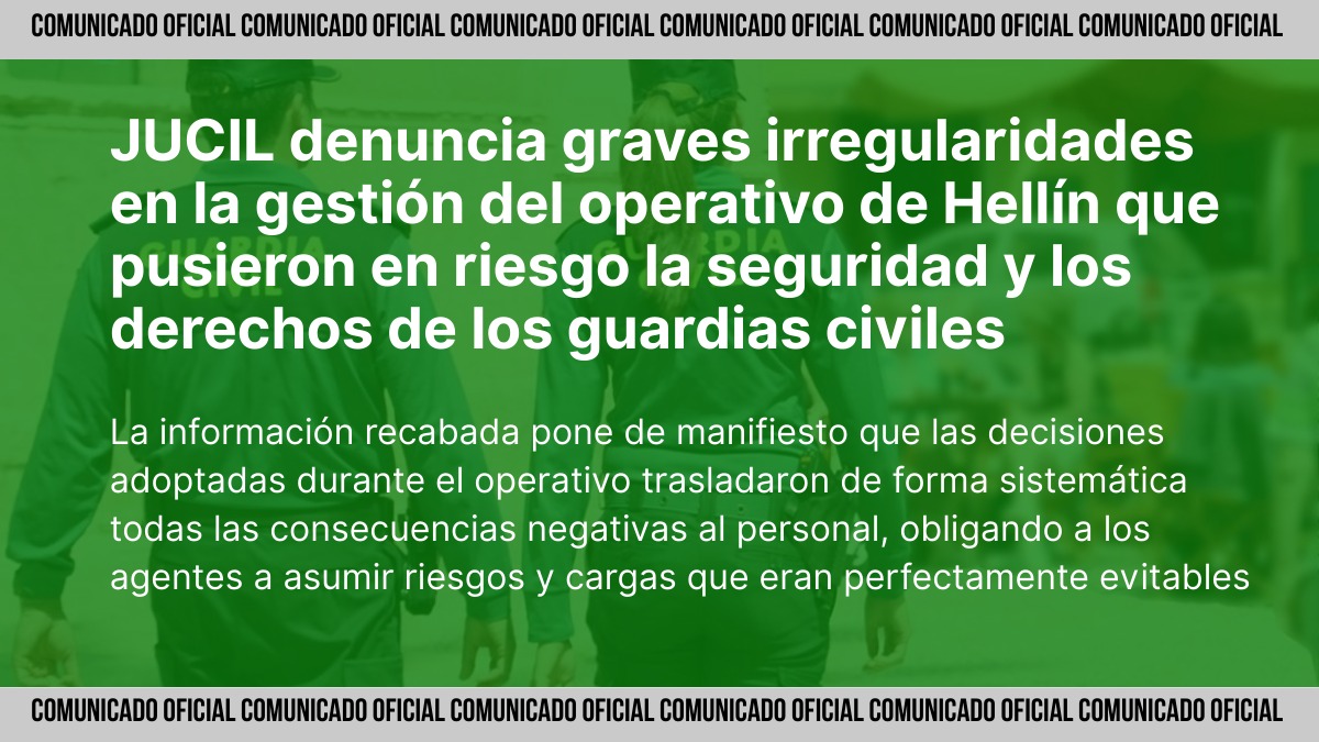 23 de enero de 2026. JUCIL ha dirigido varios escritos a la Dirección General de la Guardia Civil para denunciar la gestión del operativo desplegado en Hellín (Albacete), una actuación que evidencia una alarmante falta de planificación y que ha supuesto una vulneración de derechos básicos en materia de seguridad laboral, descanso, conciliación y retribuciones económicas.