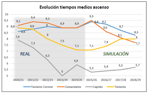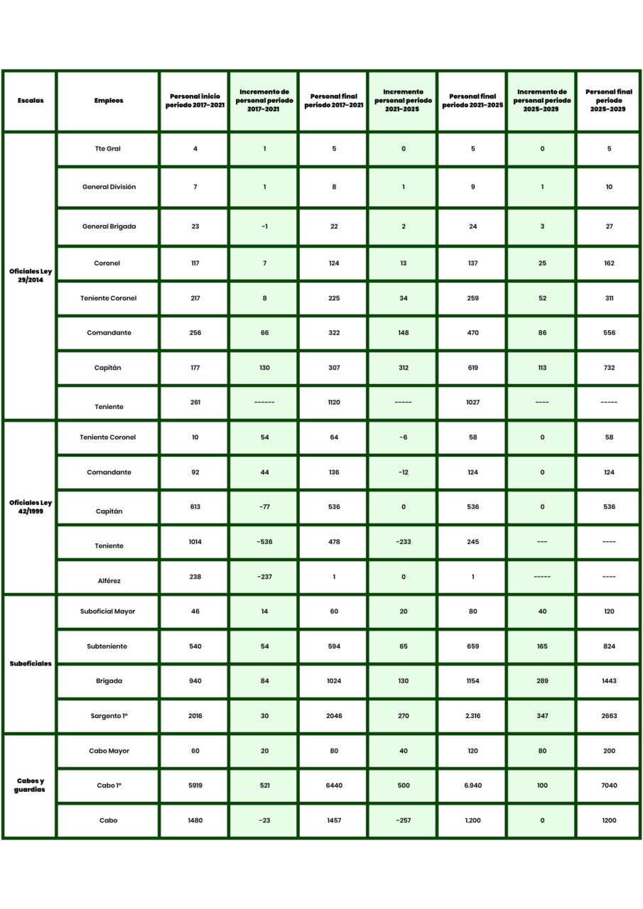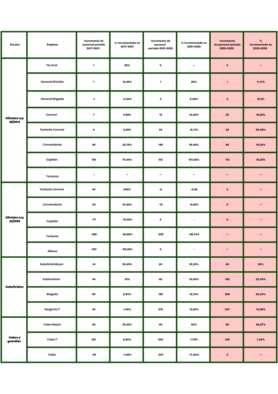 Por último, la Dirección General de la Guardia Civil ha comunicado un incremento de la plantilla de cabos 1º del 7,76% en el período 2021-2025 y una propuesta de solo el 1,44% para 2025-2029.