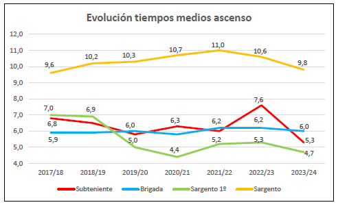 “Reconocemos los avances en los tiempos de ascenso para oficiales, pero no podemos decir lo mismo para suboficiales. El tiempo de ascenso de sargento 1º ha sido históricamente prolongado, alcanzando hasta once años”, explicaba Melisa Carmona, vocal de JUCIL suboficiales en el Consejo de la Guardia Civil.