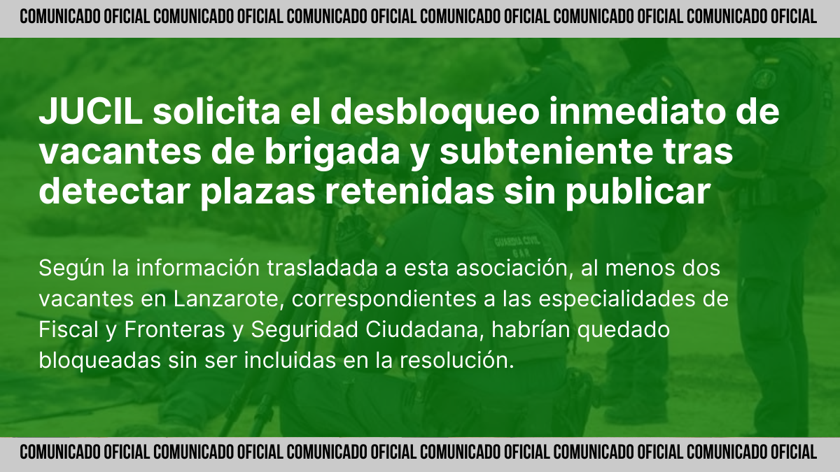 Según la información trasladada a esta asociación, al menos dos vacantes en Lanzarote, correspondientes a las especialidades de Fiscal y Fronteras y Seguridad Ciudadana, habrían quedado bloqueadas sin ser incluidas en la resolución. Esta situación afecta directamente a suboficiales recientemente ascendidos que actualmente se encuentran sin destino y que podrían optar a dichas plazas en igualdad de condiciones.