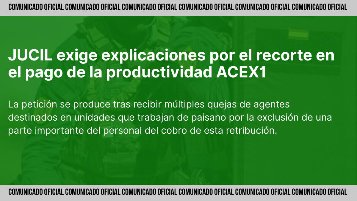 01 de diciembre de 2025. JUCIL ha solicitado con carácter urgente a la Dirección General de la Guardia Civil información detallada sobre la reducción en el pago del complemento por productividad extraordinaria ACEX1. La petición se produce tras recibir múltiples quejas de agentes destinados en unidades que trabajan de paisano, especialmente en las especialidades de Policía Judicial e Información, por la exclusión de una parte importante del personal del cobro de esta retribución.