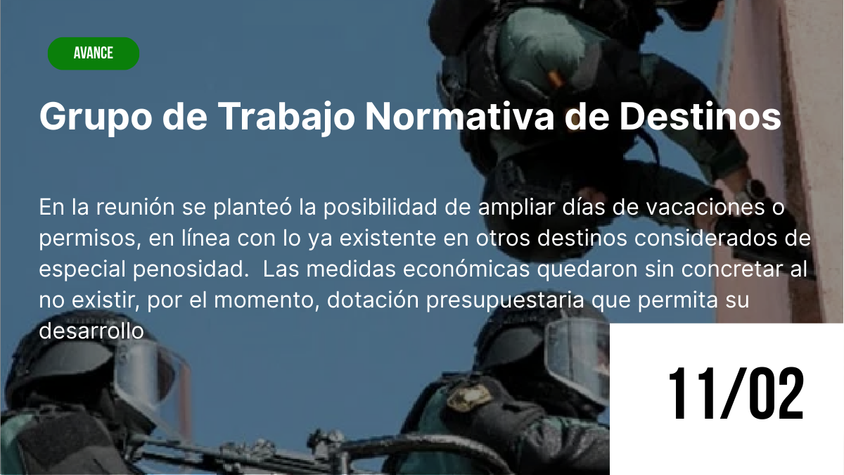 Madrid, 16 de febrero de 2026. JUCIL ha participado en el último Grupo de Trabajo sobre Normativa de Destinos (GT-8), celebrado el 11 de febrero en la Dirección General de la Guardia Civil, en el que la Administración trasladó nuevas propuestas de modificación de la normativa con el objetivo declarado de favorecer la ocupación de destinos en Cataluña, País Vasco, Comunidad Foral de Navarra e Islas Baleares, de cara a su posterior valoración en la Comisión de Normativa y en el Pleno del Consejo.