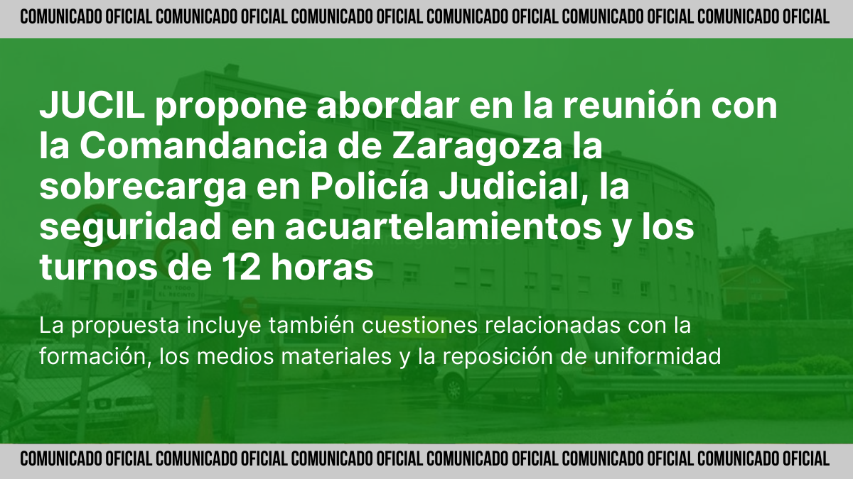 04 de marzo de 2026. JUCIL ha remitido a la Jefatura de la Comandancia de Zaragoza una propuesta de asuntos a tratar en la próxima reunión con las asociaciones profesionales convocada para el 15 de abril en el acuartelamiento de Valdespartera. En el documento, la asociación recoge las principales preocupaciones trasladadas por los guardias civiles destinados en distintas unidades de la provincia, con el objetivo de abordar soluciones que mejoren la seguridad, la organización del servicio y las condiciones laborales del personal
