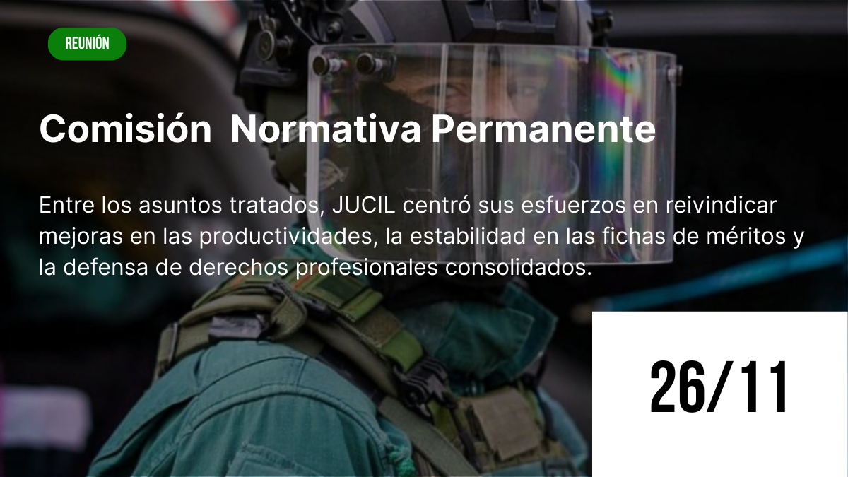 Madrid, 28 de noviembre de 2025.  JUCIL  participó el pasado 26 de noviembre en la Comisión Normativa Permanente, donde volvió a insistir en la necesidad de avanzar hacia un modelo profesional más justo, transparente y que reconozca adecuadamente el trabajo diario del personal del cuerpo. Entre los asuntos tratados, la asociación centró sus esfuerzos en reivindicar mejoras en las productividades, la estabilidad en las fichas de méritos y la defensa de derechos profesionales consolidados.