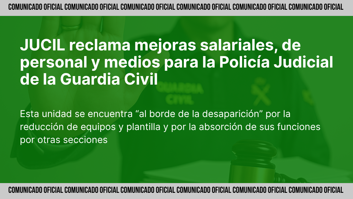 Madrid, 05 de noviembre de 2025. JUCIL ha solicitado a la Dirección General de la Guardia Civil la apertura de una investigación urgente para revisar la situación laboral del personal que desempeña funciones de Policía Judicial. La petición, registrada el 23 de octubre de 2025, denuncia el progresivo deterioro de esta especialidad, la sobrecarga de trabajo y la ausencia de compensación económica y de medios adecuados para desarrollar sus funciones.