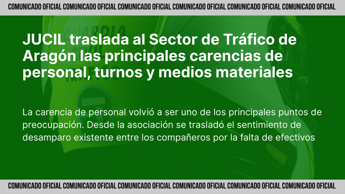Zaragoza, 12 de febrero de 2026. JUCIL ha participado en una reunión mantenida con el coronel jefe del Sector de Tráfico de Aragón en la que las asociaciones profesionales trasladaron diversas cuestiones que afectan al día a día del personal destinado en esta especialidad, especialmente en materia de productividades, falta de efectivos, implantación de turnos, dotación de material e infraestructuras.