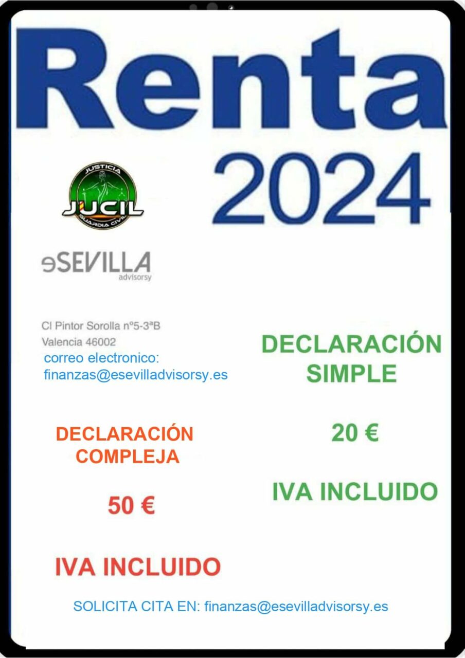 – 20€ Declaración Renta individual simple. – 50€ Declaración Renta individual compleja.